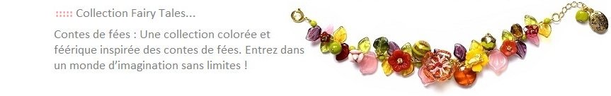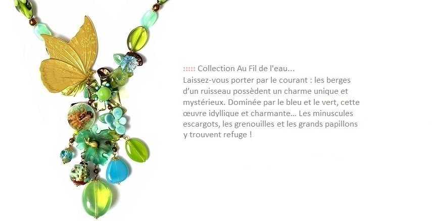 ::::: Création. Nos bijoux sont composés essentiellement de perles en verre d'origine européenne, de Venise ou de Bohême, d'Allemagne ou de France... Certaines sont parées d'or ou d'argent... mariage du feu et de savoir faire ancestral, habillées de l'éclat du cristal, de rubans de soie ou encore des reflets irisés de la nacre... Les bijoux naissent de l'imagination de leur créatrice, Dominique Brénéol Truchot... inspirée par l'environnement verdoyant, elle réinvente le thème de la nature chaque saison : Jardins luxuriants ou déclinaisons de fleurs comme des poêmes... Elle vous propose un palette chatoyante et variée... Votre seule tâche?... Suivre vos coups de cœur! |
