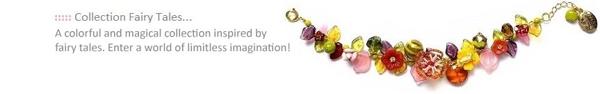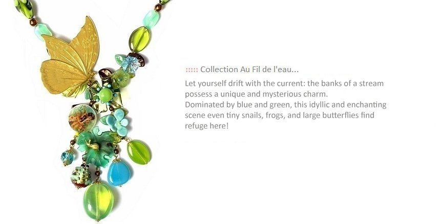 ::::: Design. Our jewelry is mostly made of glass beads of european origin : Venice, Bohemia, Germany or France. Some are adorned with gold or silver, blending fire and age-old skills, with the spark of cut glass, silk ribbons or the iridescense of mother-of-pearl. The jewelry springs from the imagination of their creator, Dominique Brénéol-Truchot. Inspired by her verdant environment, she reinvents the theme of nature each season : sumptuous gardens or a palette of flowers like poems... Always new, always sparkling... All you have to do?... Follow your heart! |